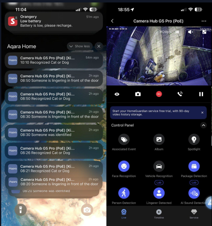 Phát hiện AI có độ chính xác đáng ngạc nhiên. Camera nhận dạng được người, gói hàng, vật nuôi, phương tiện và thậm chí cả âm thanh. Nó xác định chính xác tiếng chó cũng rất ấn tượng. Thỉnh thoảng nó nhầm một nhóm vịt với một con người, nhưng nhìn chung, nó khá chính xác. Quan trọng nhất là không có báo động giả vào ban đêm.