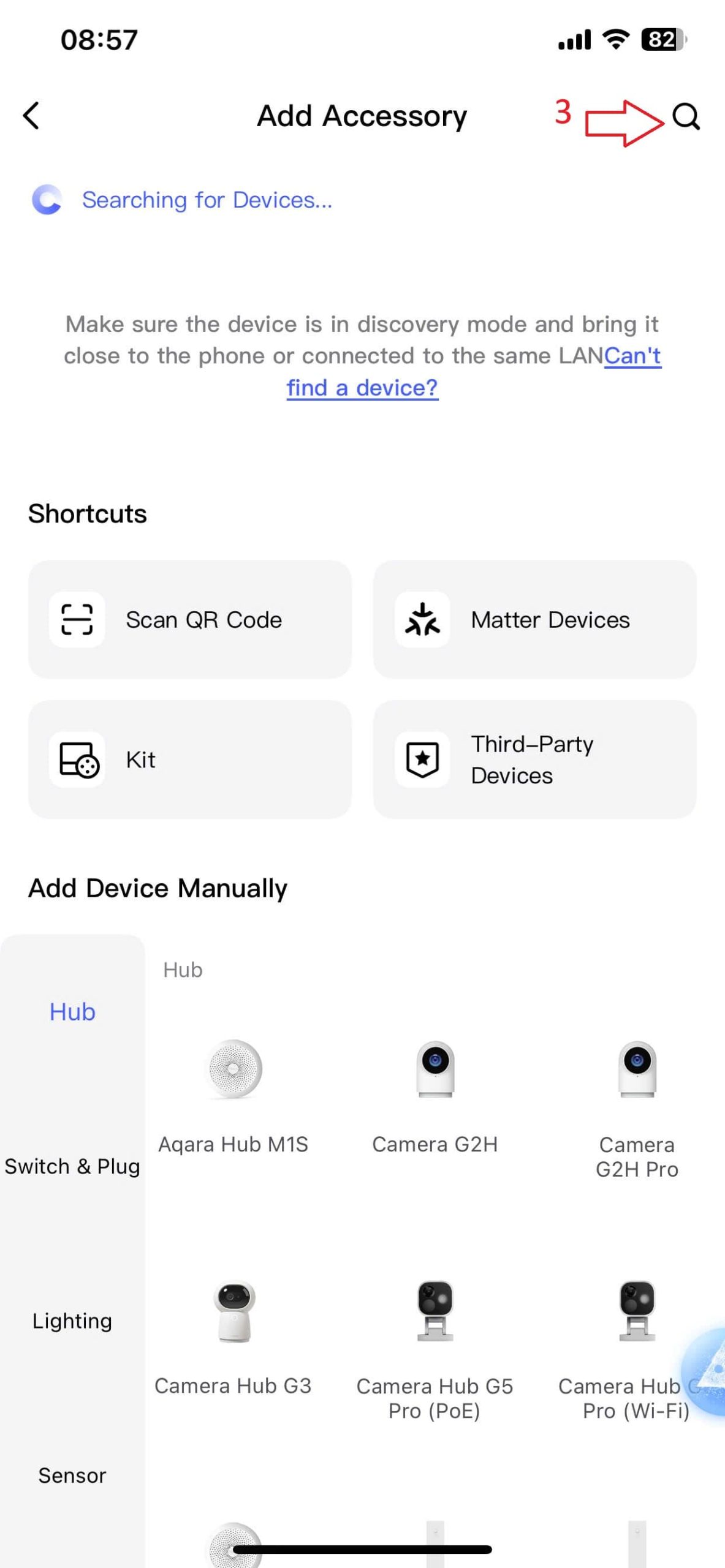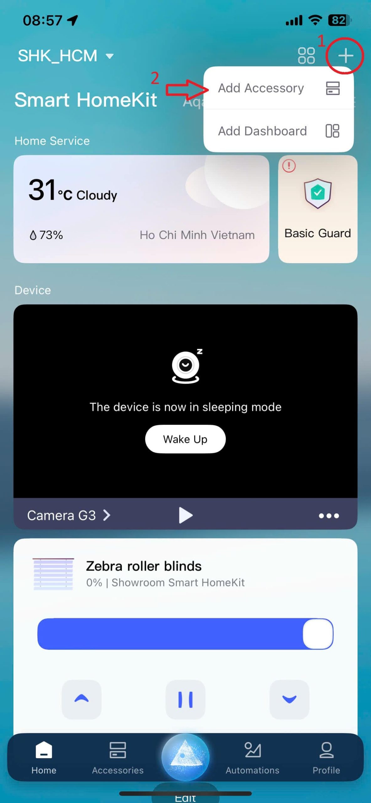Bước 1: Click vào dấu “+” góc trên bên phải màn hình trang chủ Aqara Home -> chọn “ Add Accessory “ (1,2)
