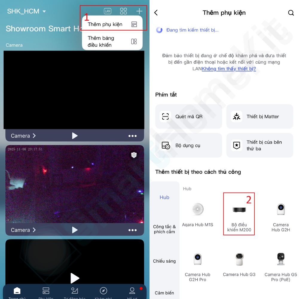 Bước 1: Tải ứng dụng Aqara Home -> bật bluetooth -> tại trang chủ chọn dấu + góc trên bên phải -> thêm thiết bị -> chọn vào hub M200