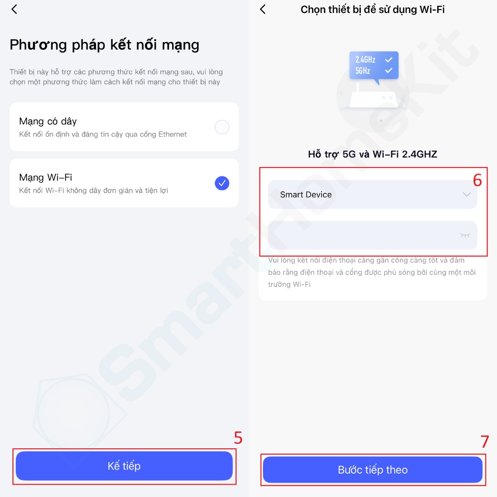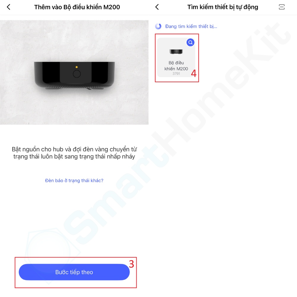 Bước 2: Sau khi chọn hub, chọn vào bước tiếp theo -> chờ tầm vài giây để quét tìm thấy thiết bị -> chọn vào thiết bị -> chọn phương án kết nối bằng wifi hoặc có dây -> nhập wifi
