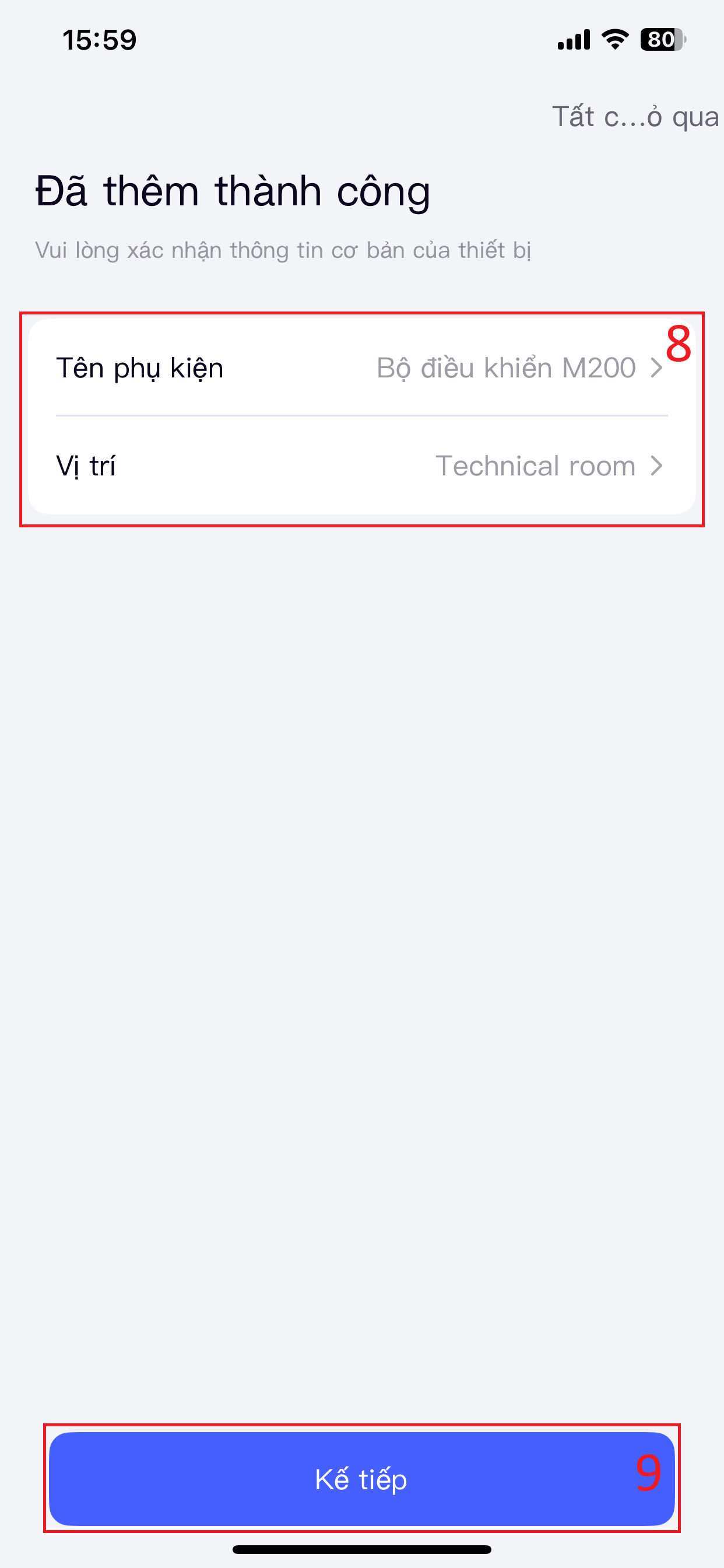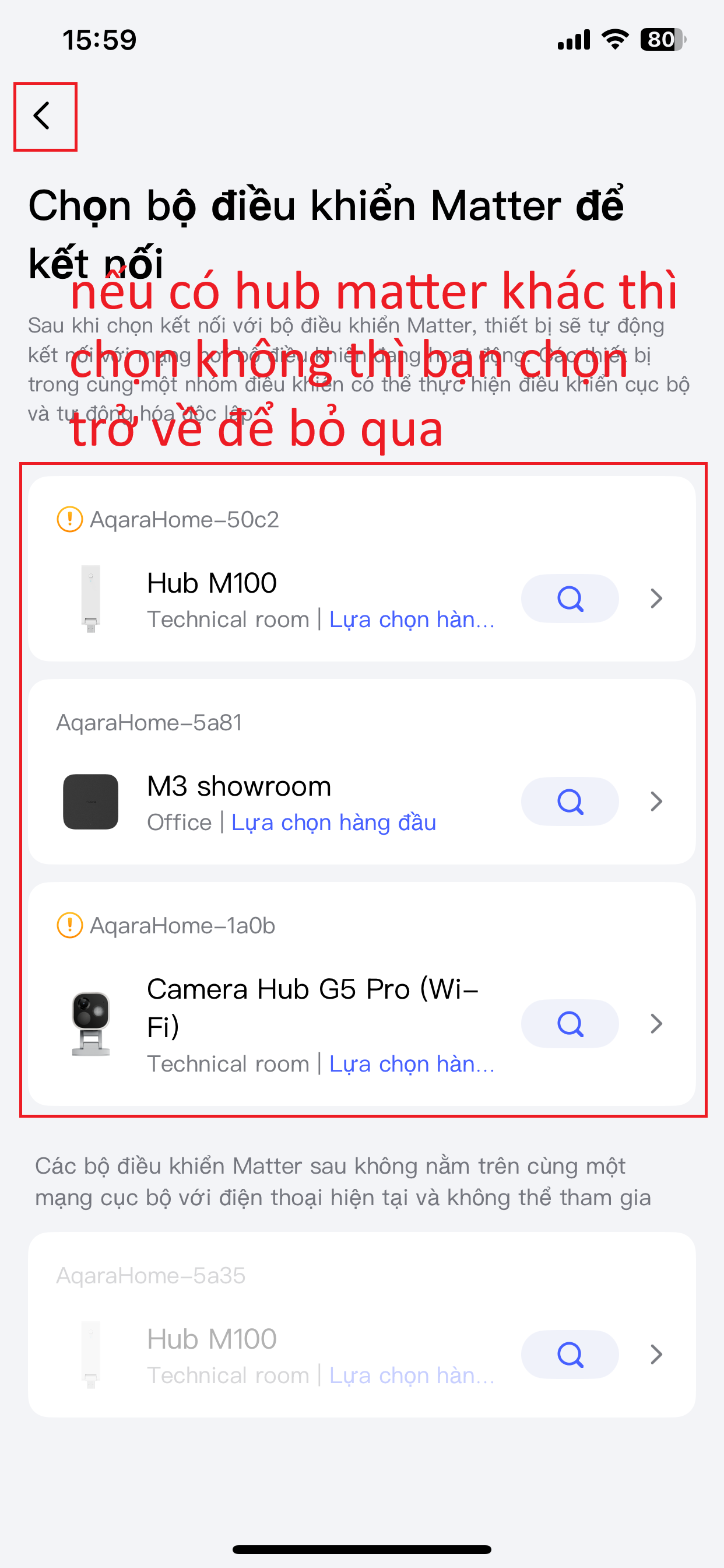 Bước 3: Nếu nhà có hub matter khác, bạn có thể chọn hub đó để hệ thống kết nối với nhau, nếu không bạn có thể chọn trở về để bỏ qua -> đặt tên, phòng và tên của hub -> chọn xong để hoàn thành các bước cài đặt hub vào bên trong ứng dụng