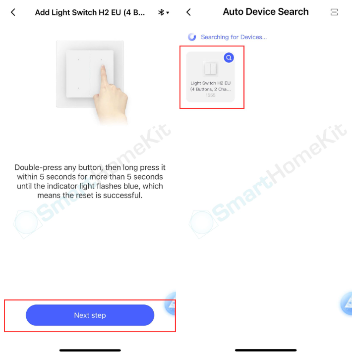 Bước 2: Bạn làm theo hướng dẫn -> Nhấn liên tục 2 lần nút bất kỳ, rồi nhấn giữ nó trong vòng 5 giây đến hơn 5 giây cho tới khi thấy đèn báo hiệu trên công tắc nhấp nháy xanh bạn bỏ tay ra khỏi nút nhấn liền. Lúc này công tắc sẽ vào chế độ kết nối (này cũng là bước để reset thiết bị về ban đầu) -> Sau khi đã vào chế độ kết nối, nhấn Next step trên điện thoại và đợi quét tìm thiết bị (hãy luôn bật Bluetooth) -> Khi tìm thấy thiết bị nhấp chọn thiết bị đó.