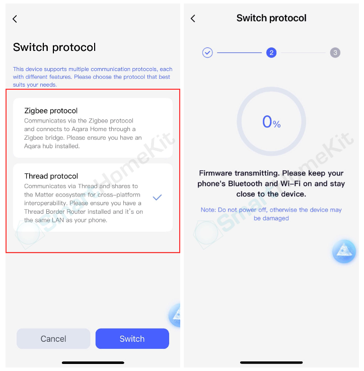 Bước 3: Hãy kiểm tra kĩ phần này, tùy thuộc vào bạn muốn trải nghiệm và Hub hiện tại của nhà bạn sẽ chọn giao thức kết nối sao cho hợp lý Zigbee hoặc Thread. Bạn có thể nhấp vào theo khung màu đỏ ở hình bên dưới để chuyển đổi giao thức kết nối -> Khi chọn giao thức kết nối mình muốn hệ thống sẽ tự động chuyển đổi Firmware cho bạn (Hãy luôn bật Bluetooth và làm theo chỉ dẫn theo hình). Ở đây mình chọn sử dụng Zigbee.