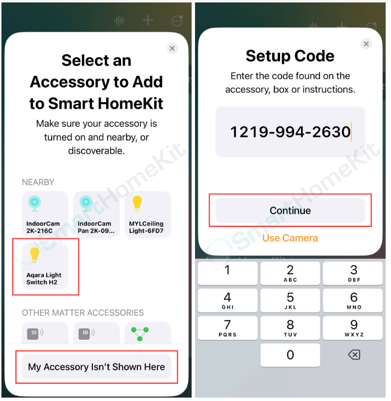 Trong trường hợp thiết bị không hiển thị ở mục NEARBY (Gần đây) -> Bạn có thể nhấp vào phần “My Accessory Isn’t Shown Here” -> Rồi nhập mã Matter của thiết bị để kết nối trực tiếp -> Chọn Continue.