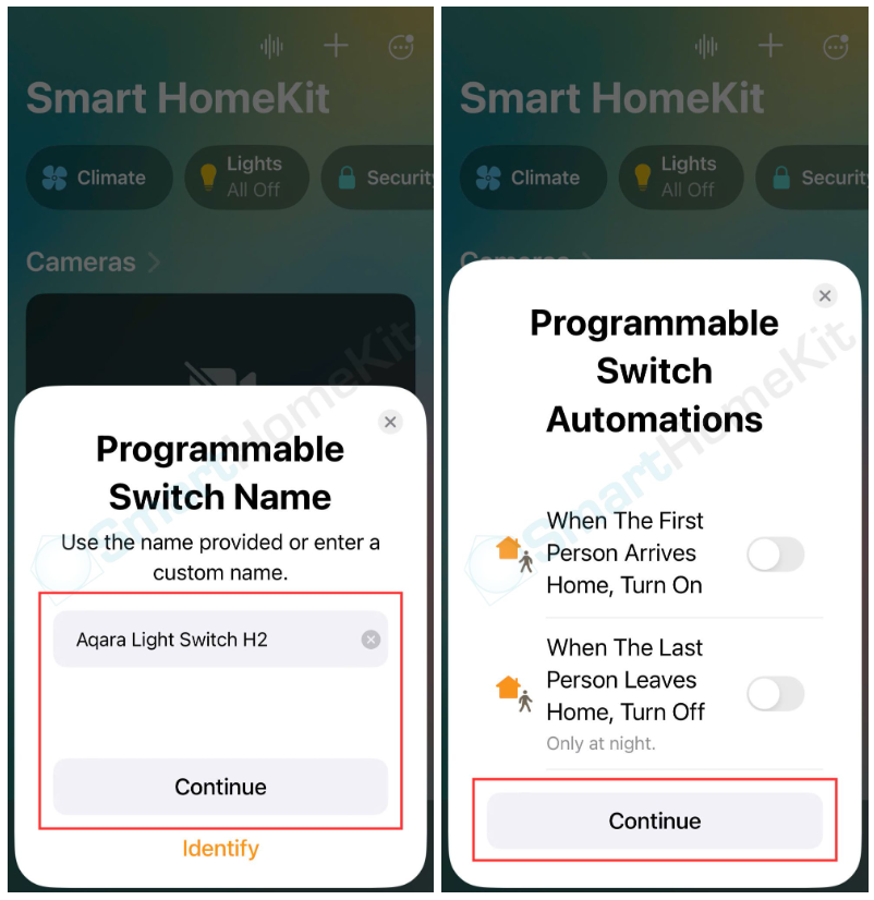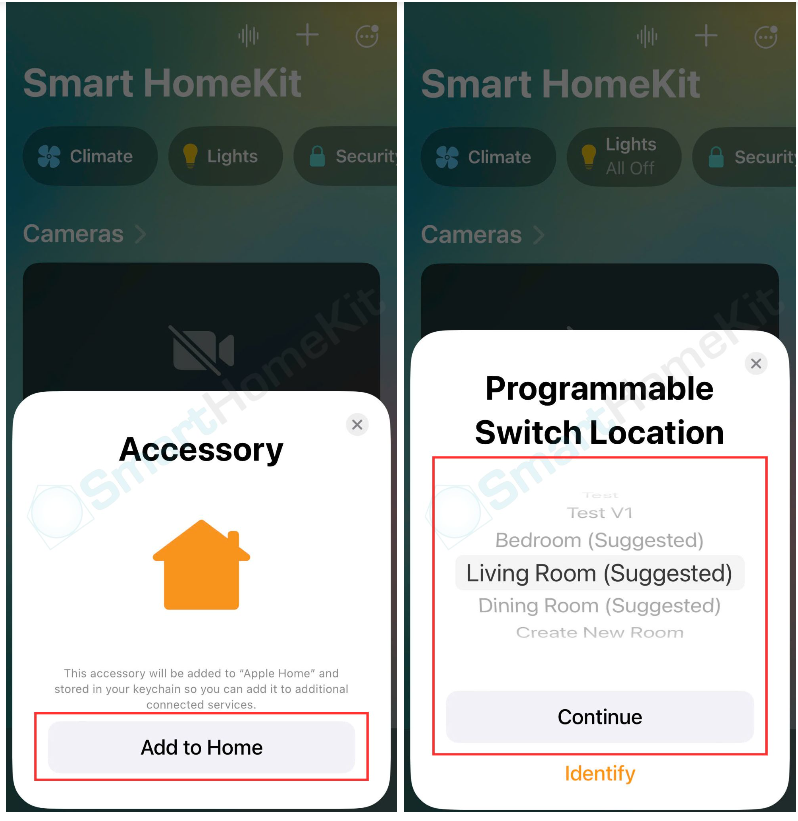 Bước 3: Sau khi quét mã QR Matter hoặc nhập mã Matter thủ công, bạn sẽ chọn vào mục “Add to Home” và đợi 1 lúc để kết nối vào hệ thống -> Chọn vị trí phòng đặt thiết bị bạn muốn thiết lập -> Đặt tên cho thiết bị -> Chọn Continue.