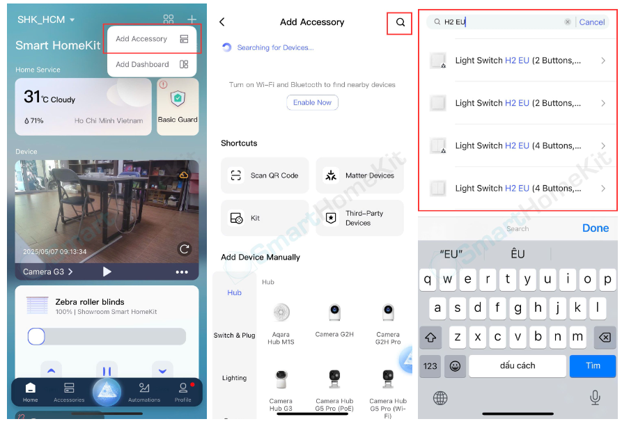Bước 1: Bạn vào app Aqara -> chọn vào Add Accessory (thêm thiết bị) -> Trên thanh tìm kiếm nhâp H2 EU để tìm kiếm nhanh hơn -> Chọn phiên bản bạn muốn kết nối.