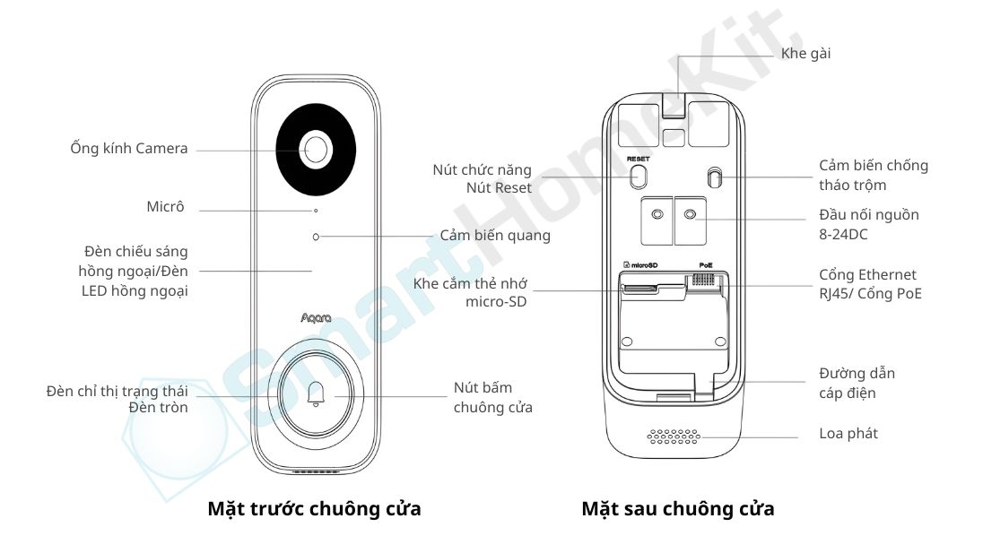Aqara G400 được thiết kế kín hoàn toàn để có thể chống chịu thời tiết chuẩn IP65 (mưa tạt và bụi). Nút nhấn có đèn hồng ngoại, để dễ dàng xác định vị trí khi tời tối. Phần camera chuông cửa bao gồm đế và thân thiết bị. Phía sau có cổng kết nối POE (hoặc LAN + Nguồn), nguồn sử dụng cho chuông G4100 được khuyến nghị từ 8-24VDC. Bên cạnh đó là cảm biến chống tháo cạy, khi thân chuông tách ra khỏi mặt tường cảm biến sẽ được kích hoạt từ đó báo động rằng chuông đang bị lấy trái phép.
