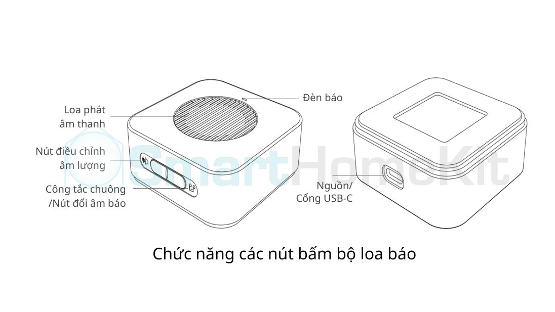 Bộ chime (loa báo) được gắn trong nhà, có tác dụng báo động mỗi khi có khách nhấn chuông. Chime được cấp nguồn qua cổng type C (có sẵn dây cáp USB-C) và bạn có thể dùng các củ nguồn có cổng USB cho bộ chime.